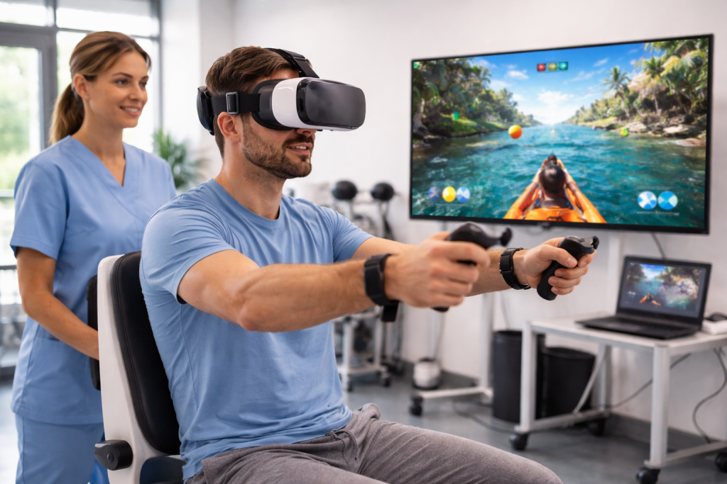 Enfin, il existe les jeux de rééducation et de réalité virtuelle utilisés en centre de soins. Pensés comme des “serious games”, ils proposent des exercices de mouvement, d’équilibre ou de coordination sous forme de mini-jeux : attraper des objets, éviter des obstacles, suivre un parcours dans un environnement virtuel. Pour les patients en rééducation après un AVC ou une opération, cela permet de prolonger l’effort, de mieux accepter la répétition des exercices, et d’obtenir des scores qui matérialisent les progrès au fil des séances.